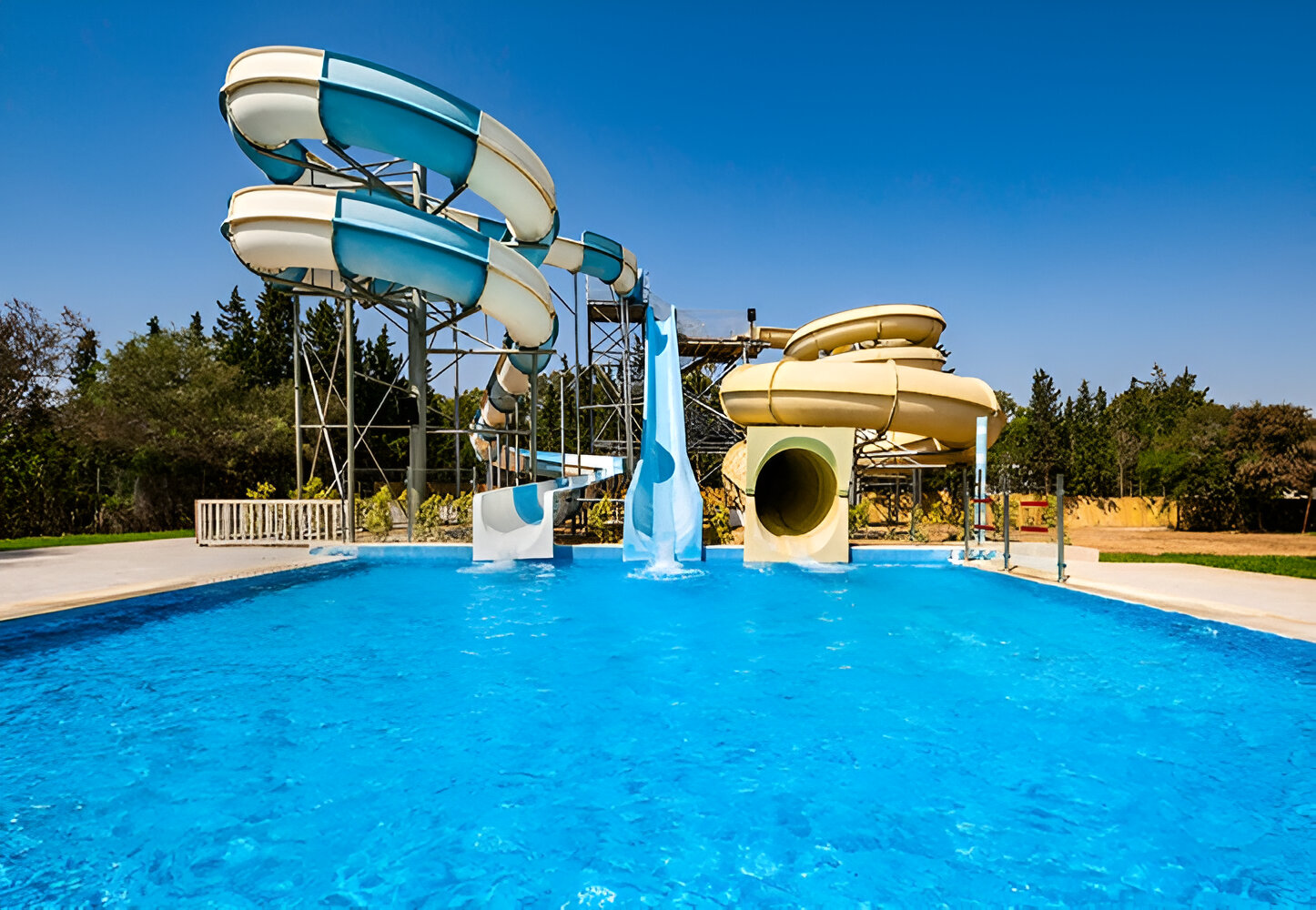 Piscines : Deux piscines extérieures (dont une pour enfants) et une piscine couverte chauffée en hiver. Un petit aquaparc avec toboggans est également présent.